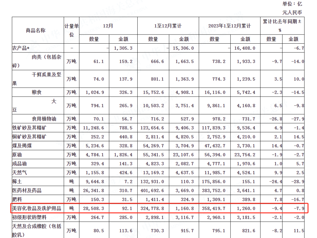值得注意的是,虽然12月的进口美容化妆品及洗护用品数据呈现双增,但2024年1-12月累计进口数量、金额较去年分别同比下滑9.4%、7.9%为32.5万吨、1160.8亿元。