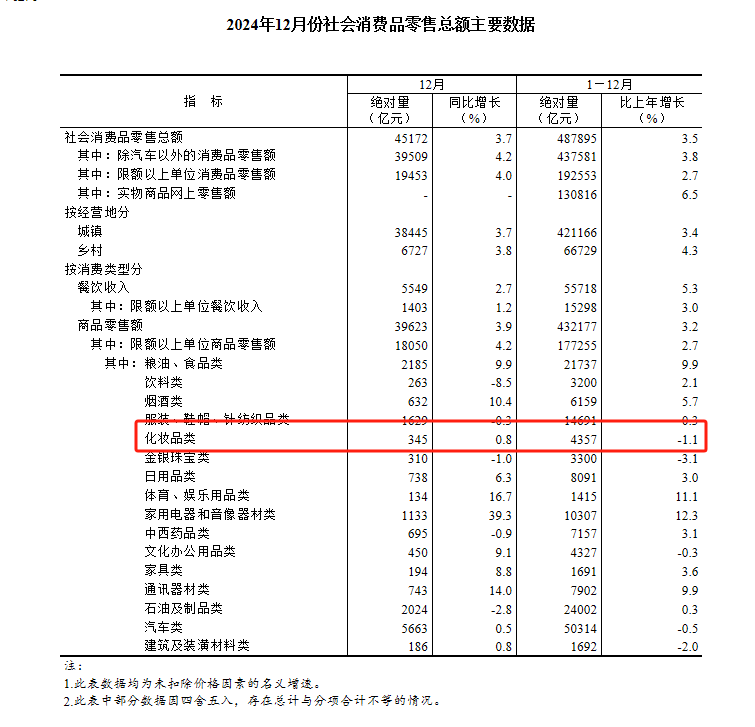 此外,据国家统计局1月17日的数据,2024年国内化妆品类零售总额同样出现下滑现象。
