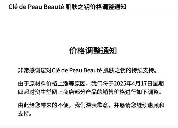1月15日,资生堂在官网发布“价格调整通知”,宣布将于2025年4月17日开始,对旗下资生堂、高端品牌肌肤之钥CPB、本土彩妆品牌INOUI以及资生堂男士的部分产品价格进行调整。