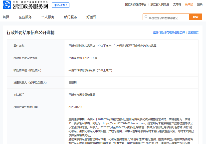 1月13日,浙江政府服务网公布一则关于《平湖市球球化妆品网店(个体工商户)生产标签标识不符合规定的化妆品案》的处罚决定,该店铺因销售未备案化妆品等多项违规问题,被平湖市监局处以合计290.2万元人民币的罚款,成为开年以来化妆品行业最大罚单。