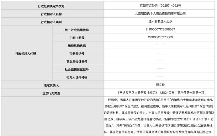 此次被罚,因屈臣氏在美团平台开设的店铺内销售多款商品存在虚假宣传行为,包括宣传力士植萃净澈香皂具有“保湿”功效、滋源强韧修护氨基酸泡泡洗发水具有防脱功效、云南白药牙膏具有“消炎止血”功效等,但均未提供相关证明材料。