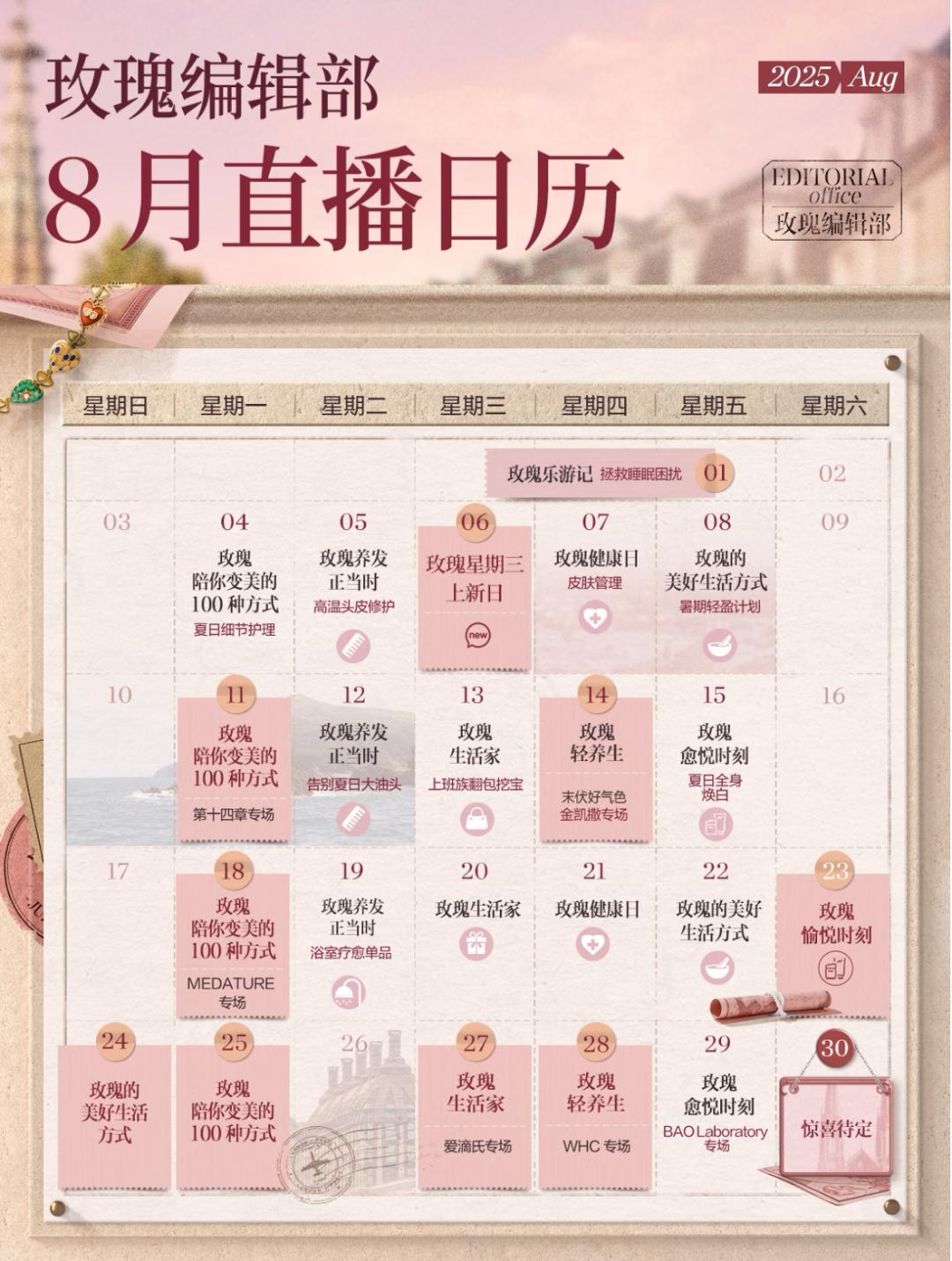 从其8月直播日历来看,日常场次主题鲜明:周一聚焦“玫瑰陪你变美的100种方式”,周二主打“玫瑰养发正当时”,周三则设为“玫瑰上新日”;除常规带货外,更有多个专场蓄势待发——8月11日将迎来第十四章品牌专场,14日开启凯撒专场,18日、27日、28日还将陆续上线 MEDATURE、爱滴氏、WHC专场。