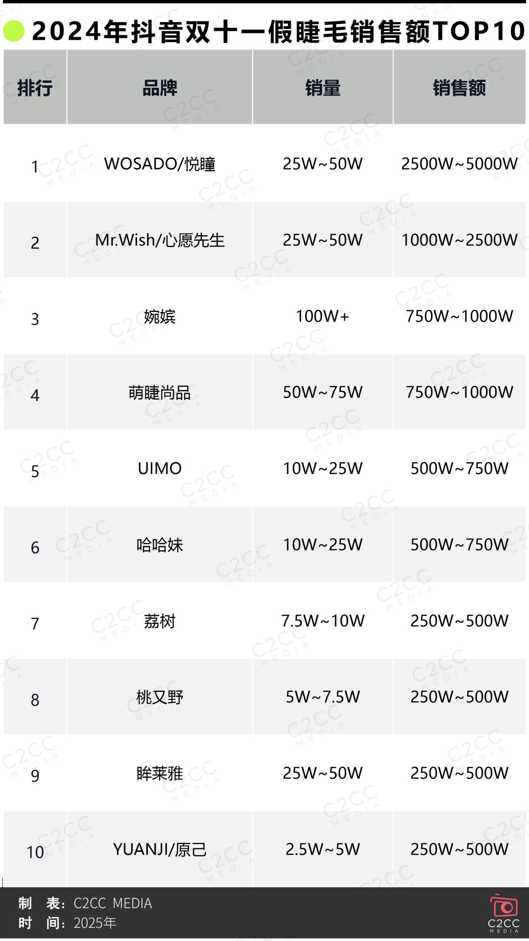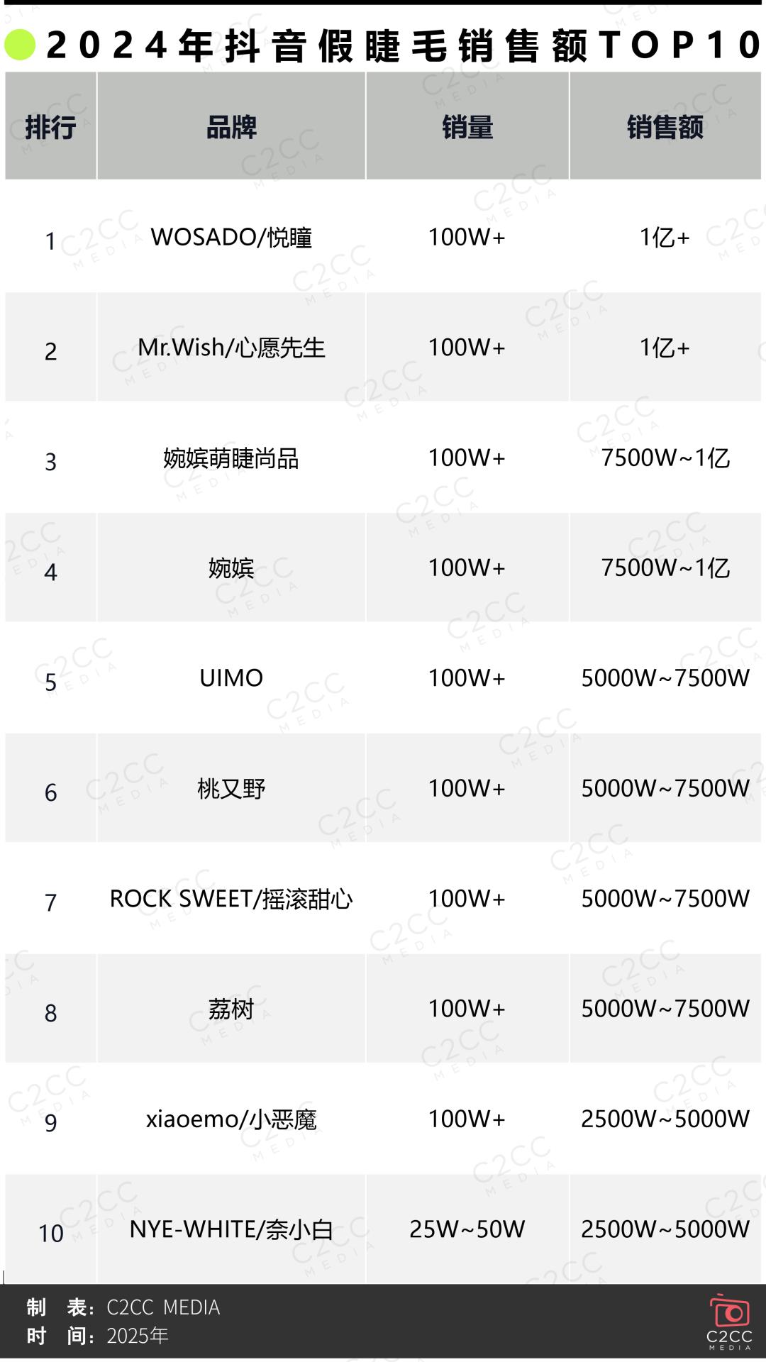 2024年,WOSADO悦瞳在抖音平台销量1亿+,成功登顶抖音平台假睫毛品类销售额年榜TOP1。