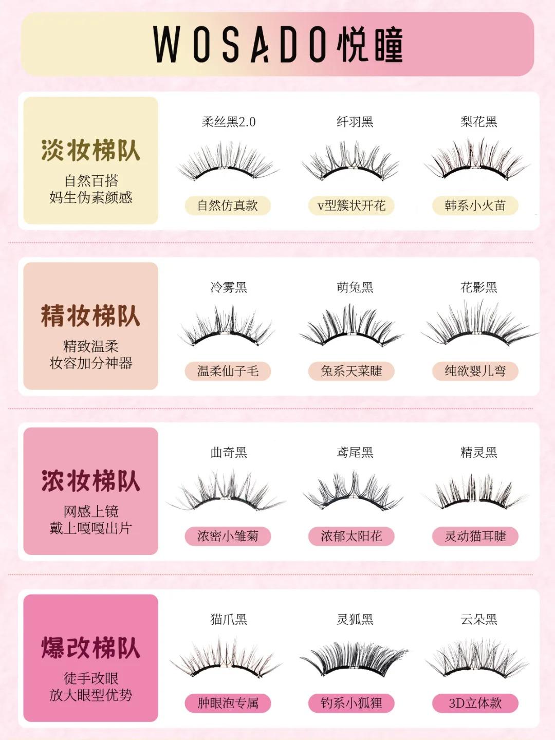 为了更好地满足消费者在不同社交场景下的美睫需求,WOSADO悦瞳深耕用户需求,打造了能够覆盖不同场景的四大系列产品。