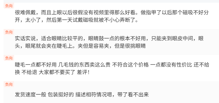 据第三方平台总结的WOSADO悦瞳抖音官方旗舰店消费评价中,正向比例占77.97%,负向比例则占12.32%。其中好评多为“商品样式好看、物流快、包装好、安全”;而差评则集中在于“佩戴难、眼型挑、磁吸脆、性价比模糊”等方面,因此悦瞳可将目光聚焦于用户的真实感受,从而将批评转化为产品进化的燃料。