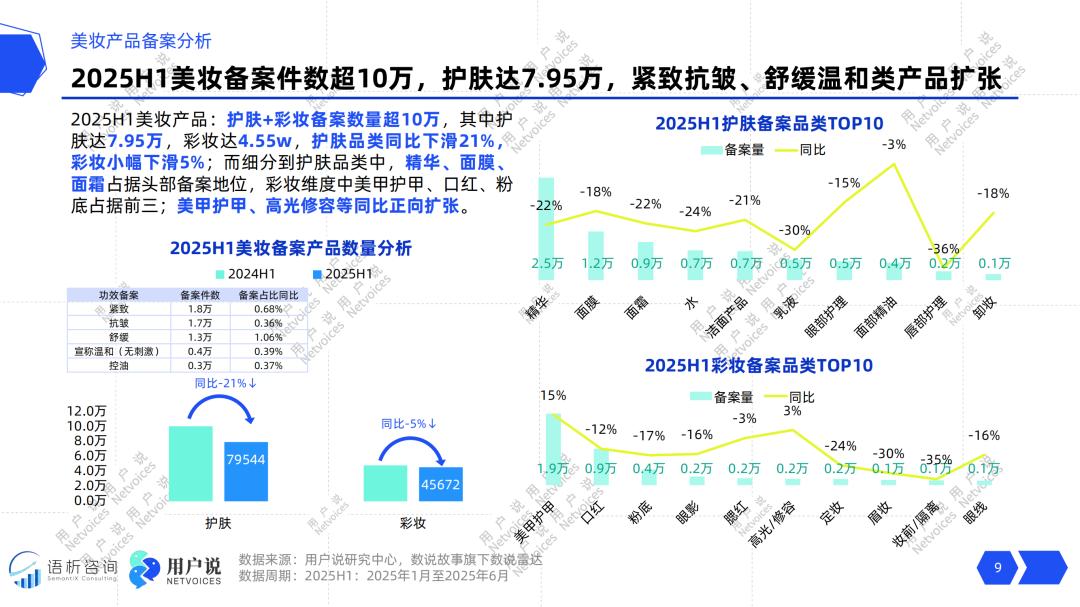 用户说数据显示,2025年上半年,护肤+彩妆备案数量超10万,其中护肤达7.95万,彩妆达4.55w,护肤品类同比下滑21%,彩妆小幅下滑5%。由此可见,当护肤市场逐渐趋于饱和时,彩妆市场反而具有更大的发展潜力。