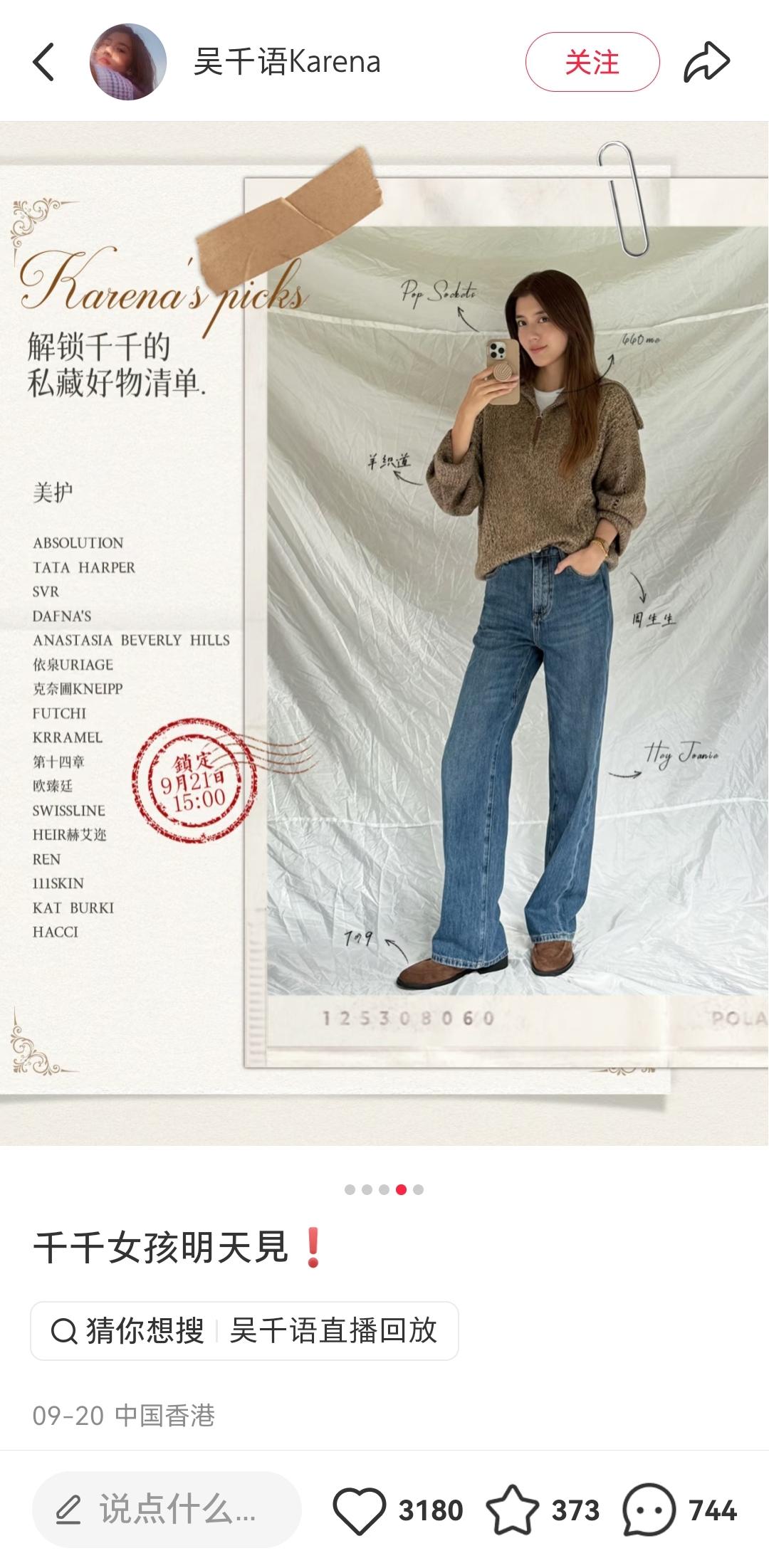 除小红书官方发布的预热长图外,吴千语还巧妙结合个人生活场景,拍摄了多条充满生活气息的预热视频,点燃了观众期待。9月20日,她在个人主页正式发布直播预告,详细展示了涵盖美护、家居、美食、保健品等多个品类的带货清单。