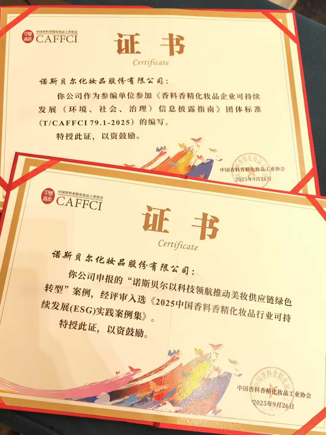 在近期举办的2025中国香妆行业可持续发展(ESG)论坛中,中国香料香精化妆品工业协会(以下简称:香妆协会)发布《2025中国香料香精化妆品行业可持续发展(ESG)报告》(以下简称ESG报告)。诺斯贝尔作为参编单位起草行业首个《香料香精化妆品企业可持续发展(环境、社会、治理)信息披露指南》团体标准(以下简称团标),于此次活动中迎来亮相。同时,诺斯贝尔及其ESG实践再度被收录至2025可持续发展实践案例集。