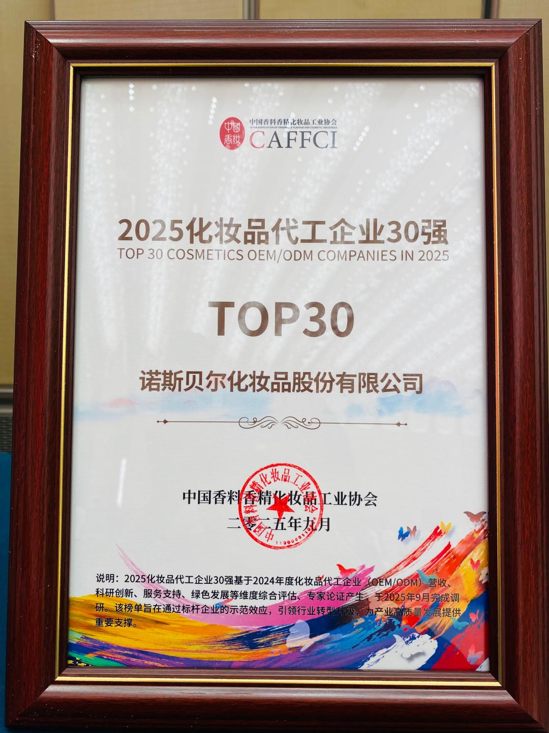 同期,香妆协会评定的《2025化妆品代工企业30强榜单》出炉,诺斯贝尔以研发创新和产能升级重构产业价值链,并通过ESG理念引领实现绿色发展,成功入选中国化妆品代工30强。