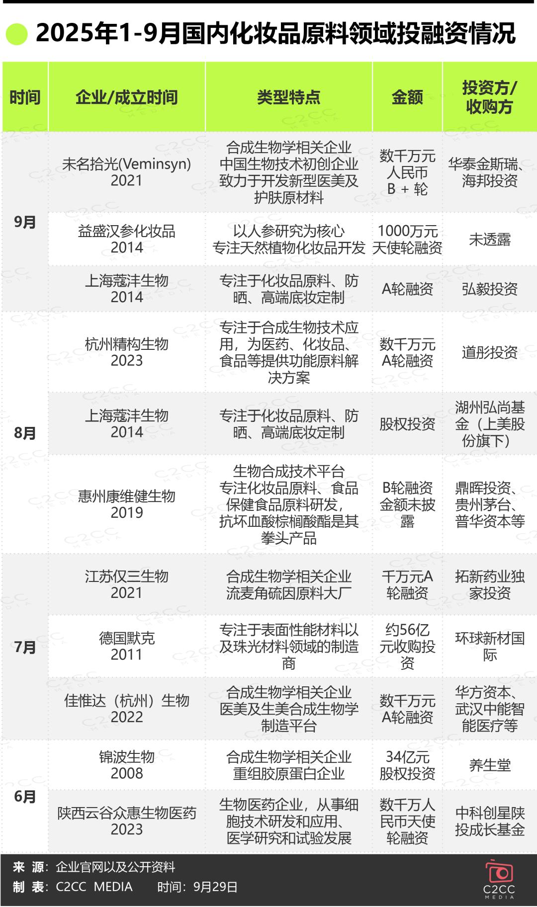 生物技术的突破正重塑全球产业格局,传统化工制造向低碳生物制造的转型已成必然。聚焦化妆品原料赛道,据C2CC传媒X新妆不完全统计,2025年1-9月,国内相关投融资事件至少31起,超8成资金流向合成生物学相关企业。