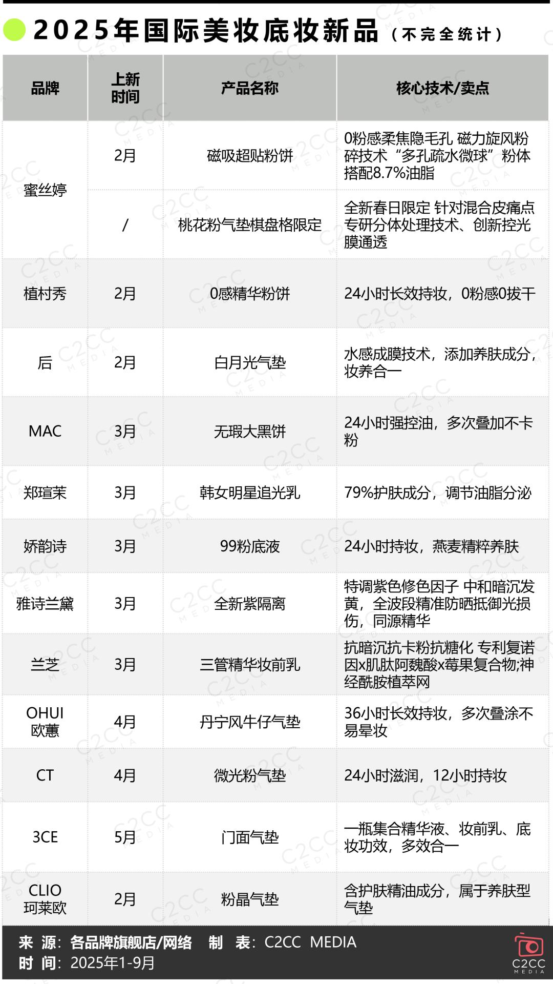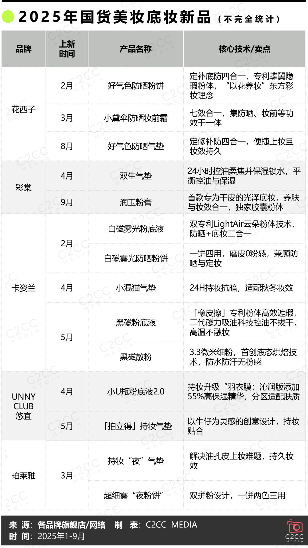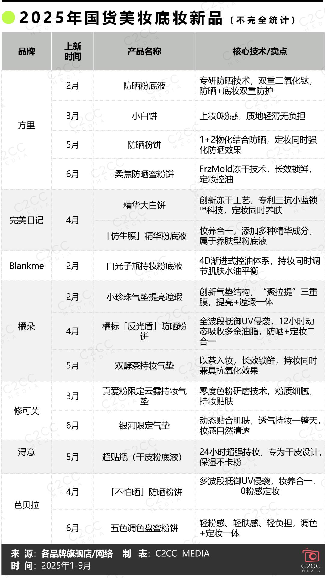 无论是国际大牌,还是国货头部企业,亦或是彩妆新锐,都在通过精准洞察消费变化,发力科研创新,2025年1-9月相继推出的各大底妆新品,从一饼多用的防晒粉饼、“妆养合一”精华粉底液,再到长效持妆且养肤的防水气垫、专为熬夜设计的“夜粉饼”,在多功能、多场景、多形态上打造差异化竞争,满足注重功效与性价比的大众消费者和追求奢享体验的高端客群。