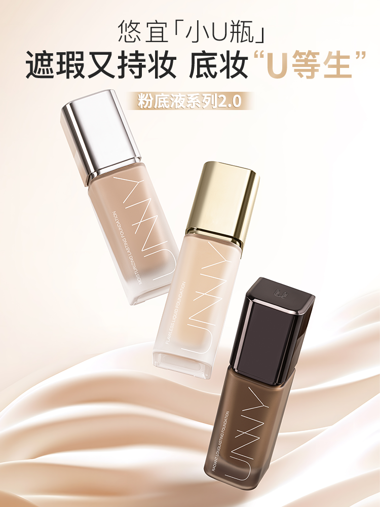 4月,佩莱集团旗下新手一站式美妆品牌UNNY CLUB悠宜(以下简称悠宜),则针对年轻用户“日常带妆易蹭、出汗脱妆”的痛点,对粉底液进行迭代——推出了小U瓶粉底2.0版本。