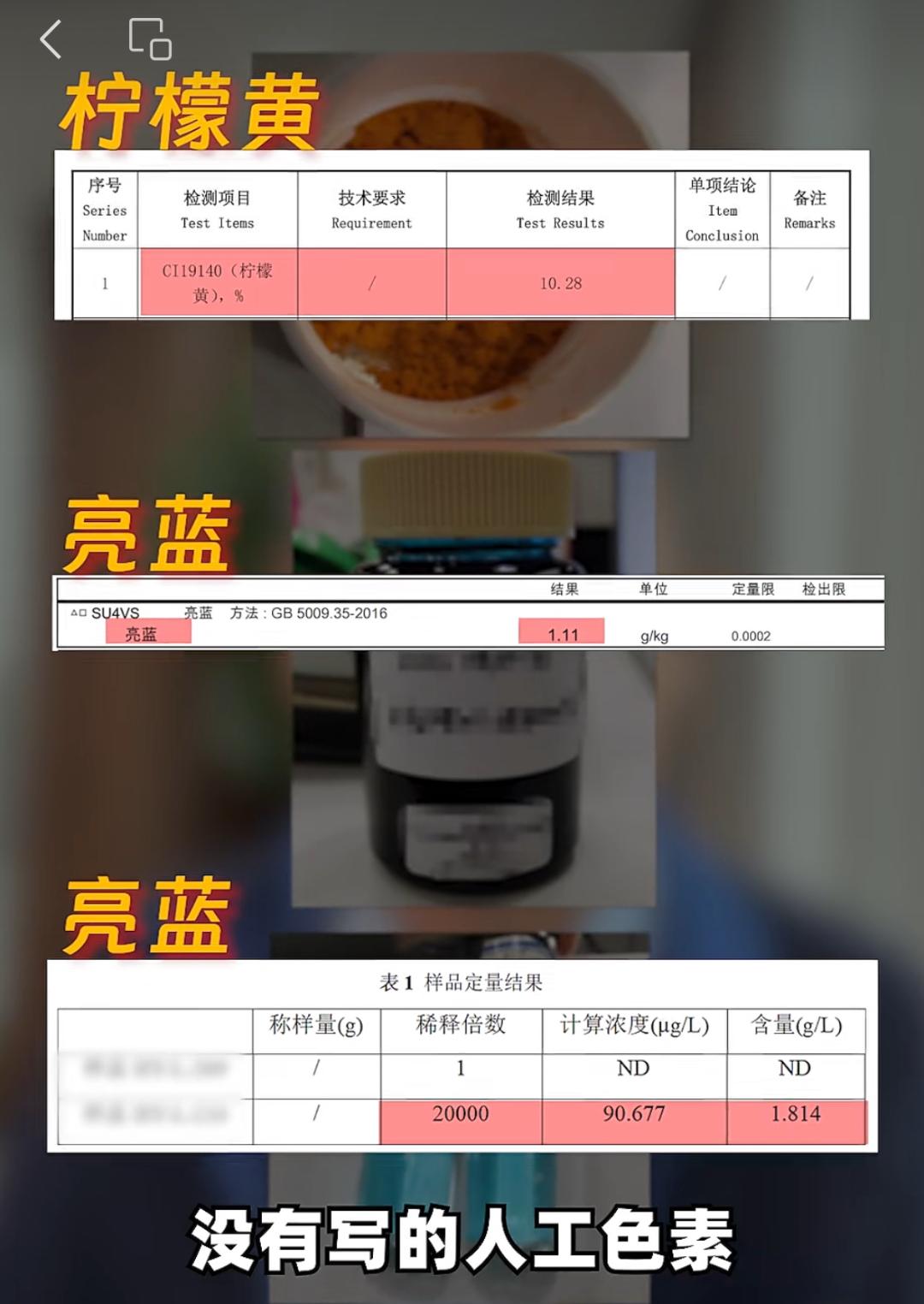 更令人震惊的是,老爸评测在后续调查中发现,康博已是“惯犯”:“我们另外检测过他们家的其他3个纯植物原料组,全部都检出了没有写明的人工色素(柠檬黄、亮蓝、亮蓝)。”