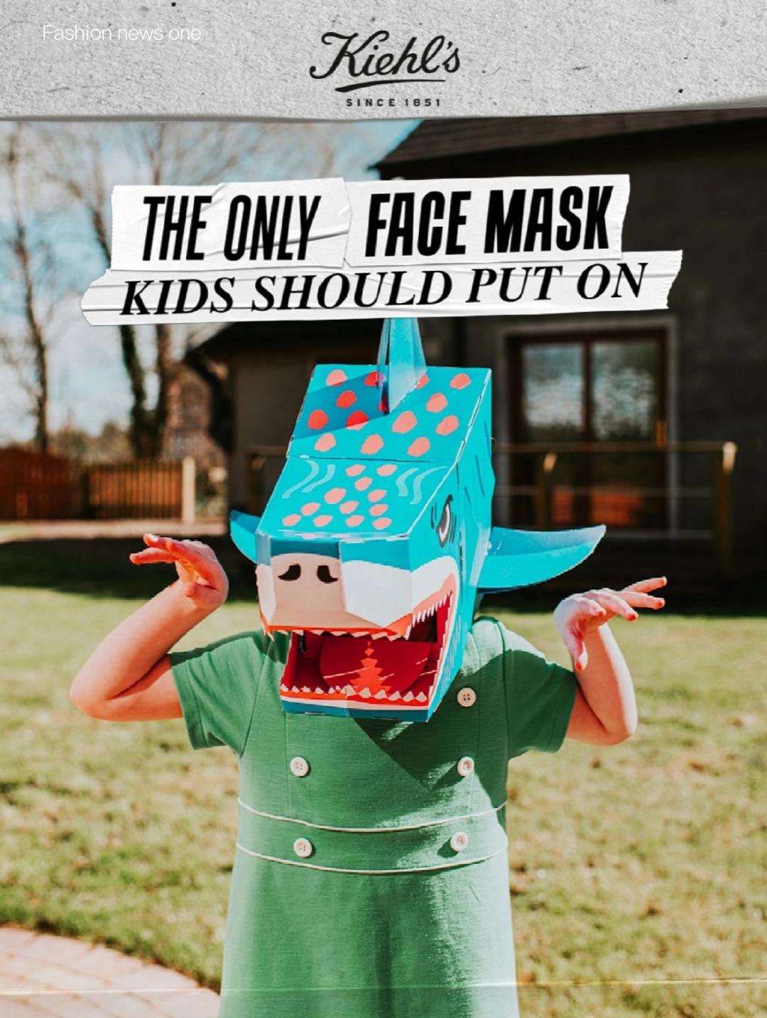 11月8日,科颜氏在Instagram上发布了一张童趣照片,一个孩子戴着纸板鲨鱼面具。