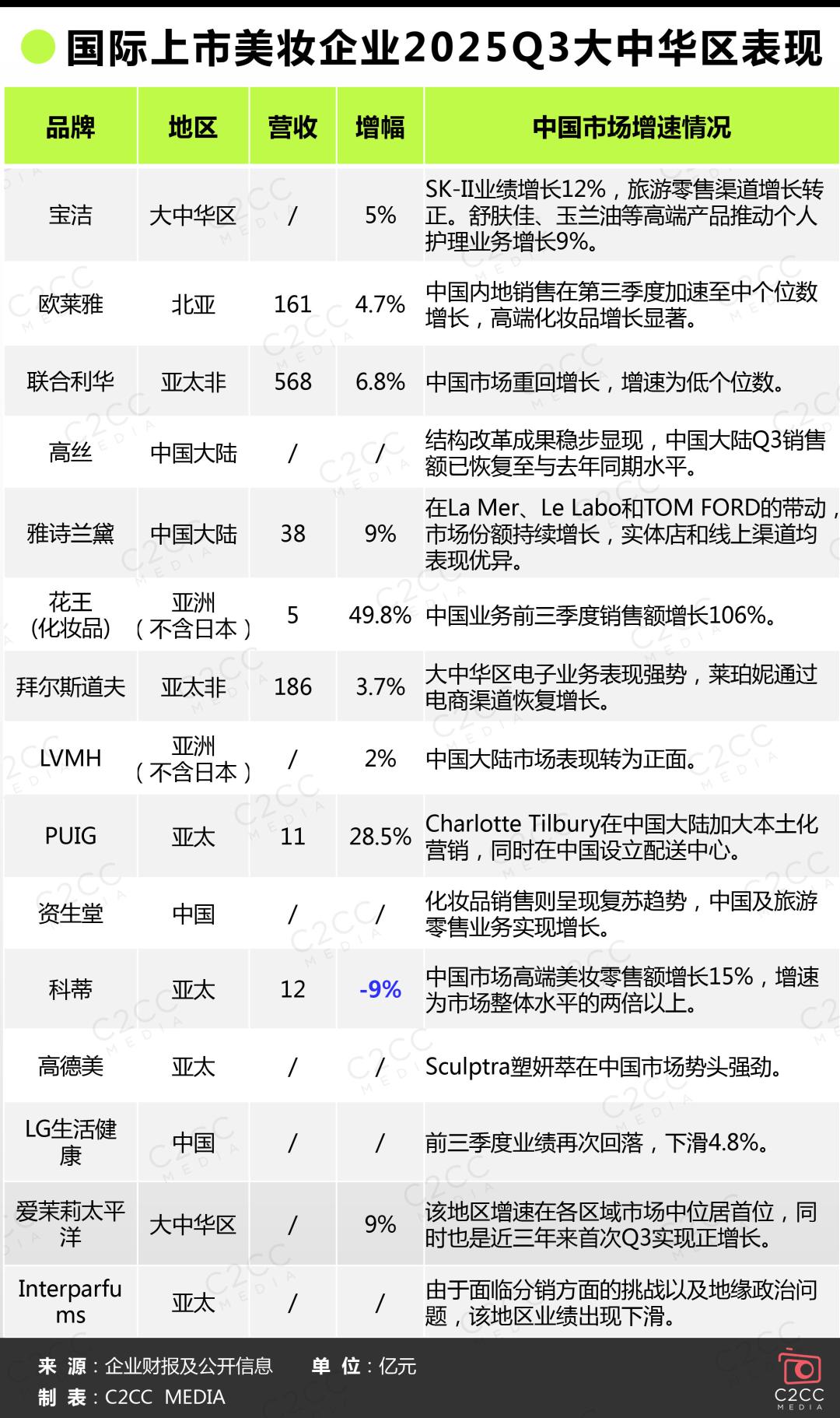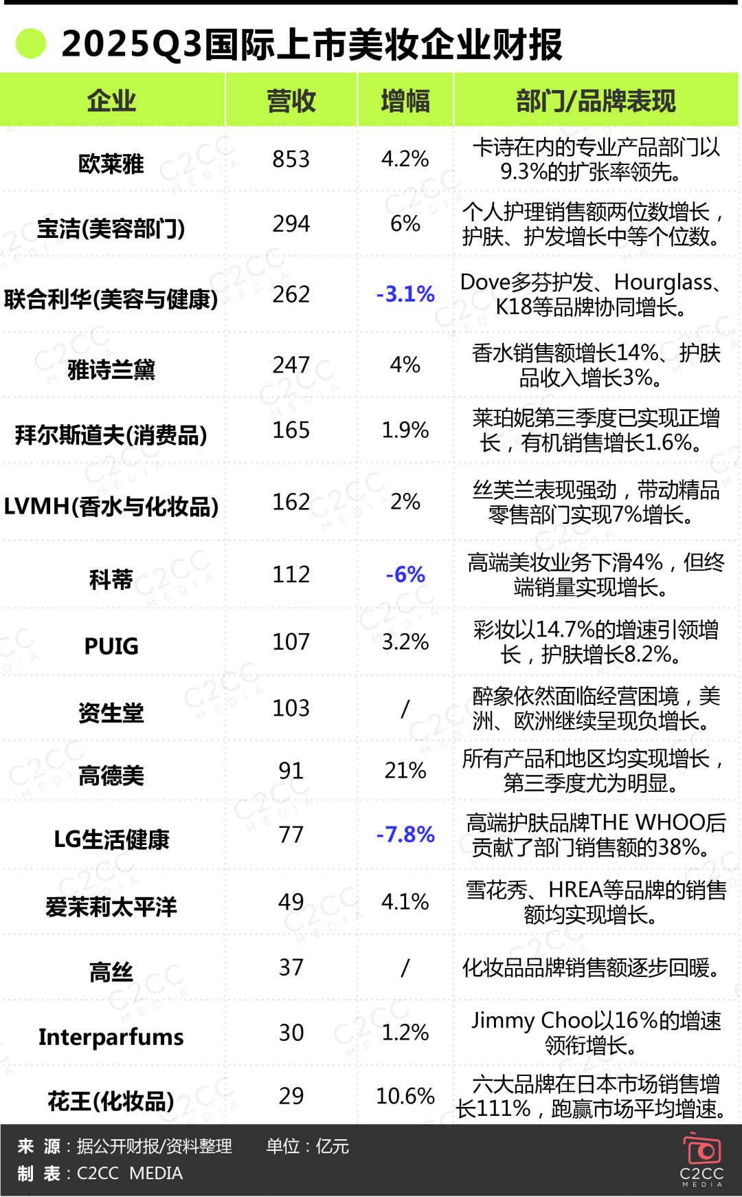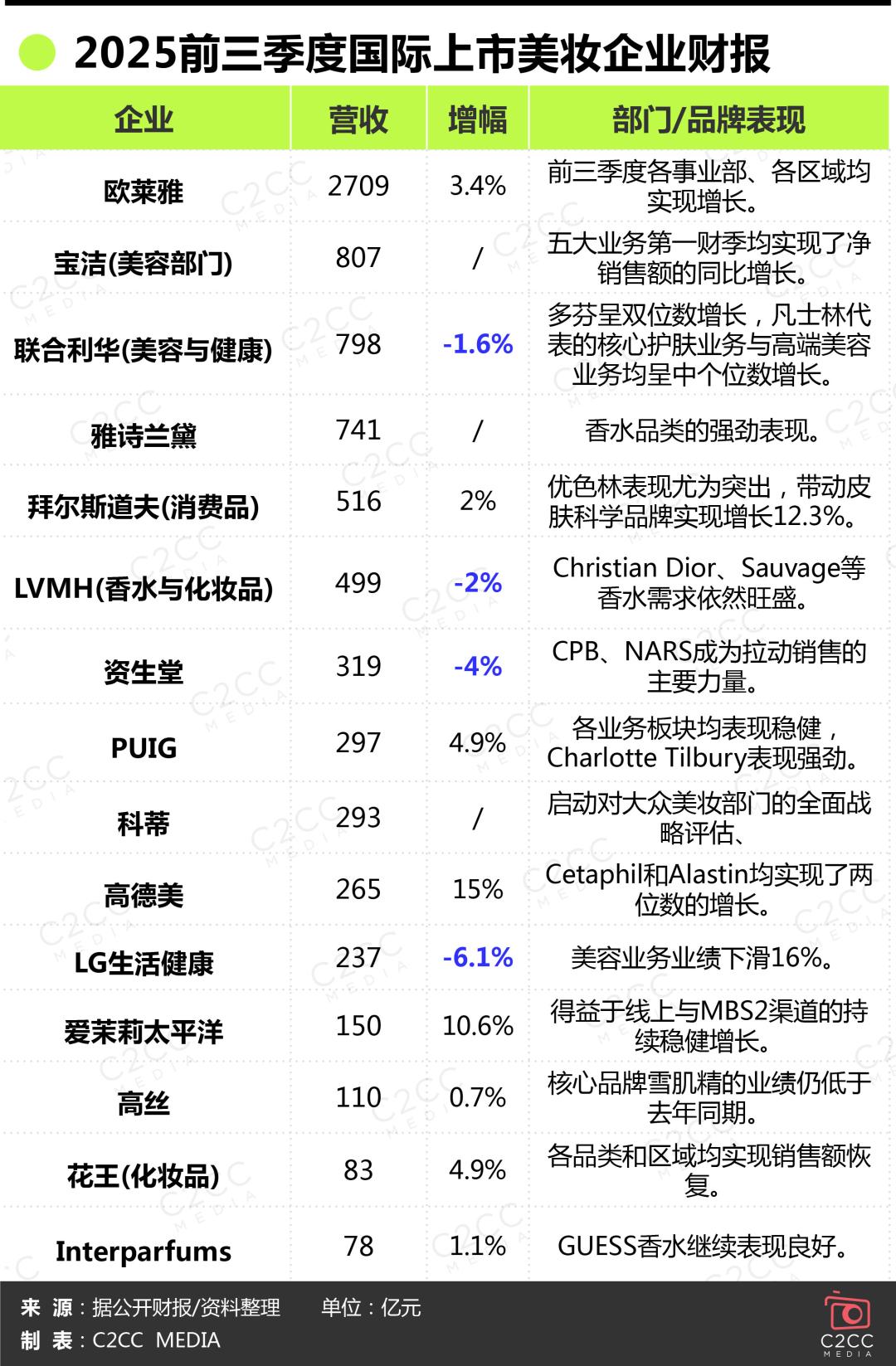 C2CC传媒X新妆整理了全球数十家上市美妆企业的三季报后,我们有如下几点发现: