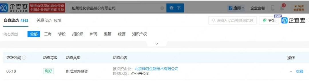 近日,根据企查查信息,北京桦冠生物技术有限公司(以下简称“桦冠生物”)的股东名单中新增了“珀莱雅化妆品股份有限公司”,不过目前暂未公布投资比例。