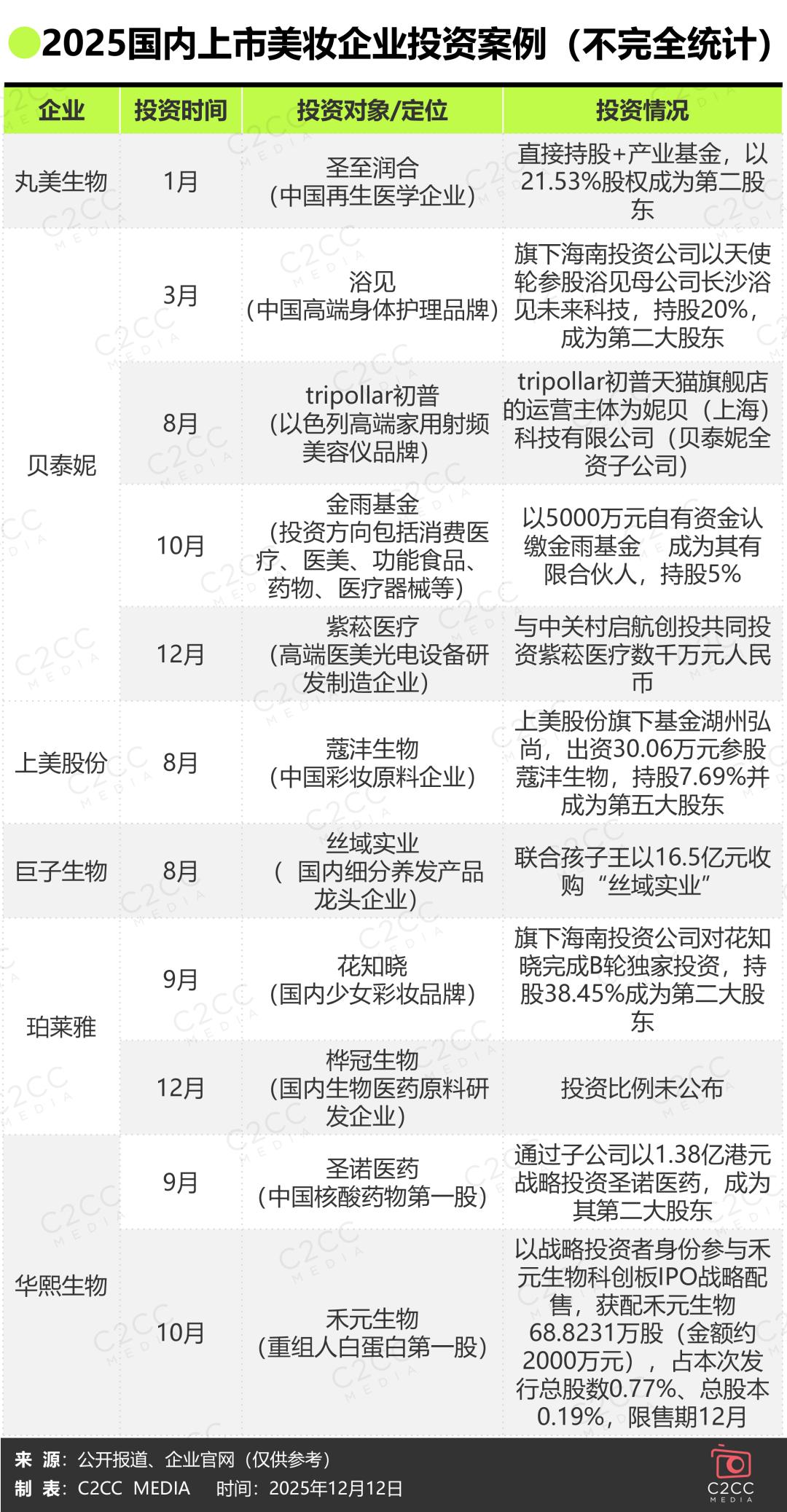 据C2CC传媒X新妆不完全统计,今年以来国内美妆上市企业已发生至少11起公开投资,主要集中在再生医学、美容仪器、功效与彩妆原料等高壁垒领域,以及彩妆、身体护理等高潜力品牌和产业基金。