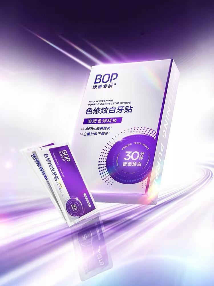 新品特色:BOP色修炫白牙贴主打即时焕白体验,一贴即可显现去黄提亮成效。产品通过权威机构功效实测认证:30分钟快速去黄,7天美白提升9度,14天美白效果再升级。