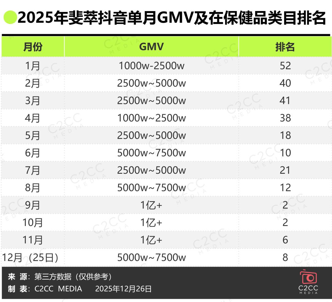 第三方数据显示,今年6-12月,斐萃5次跻身单月抖音滋补保健类目TOP10,其中9月、10月连续排名第2,仅次于诺特兰德,3次月GMV破亿。