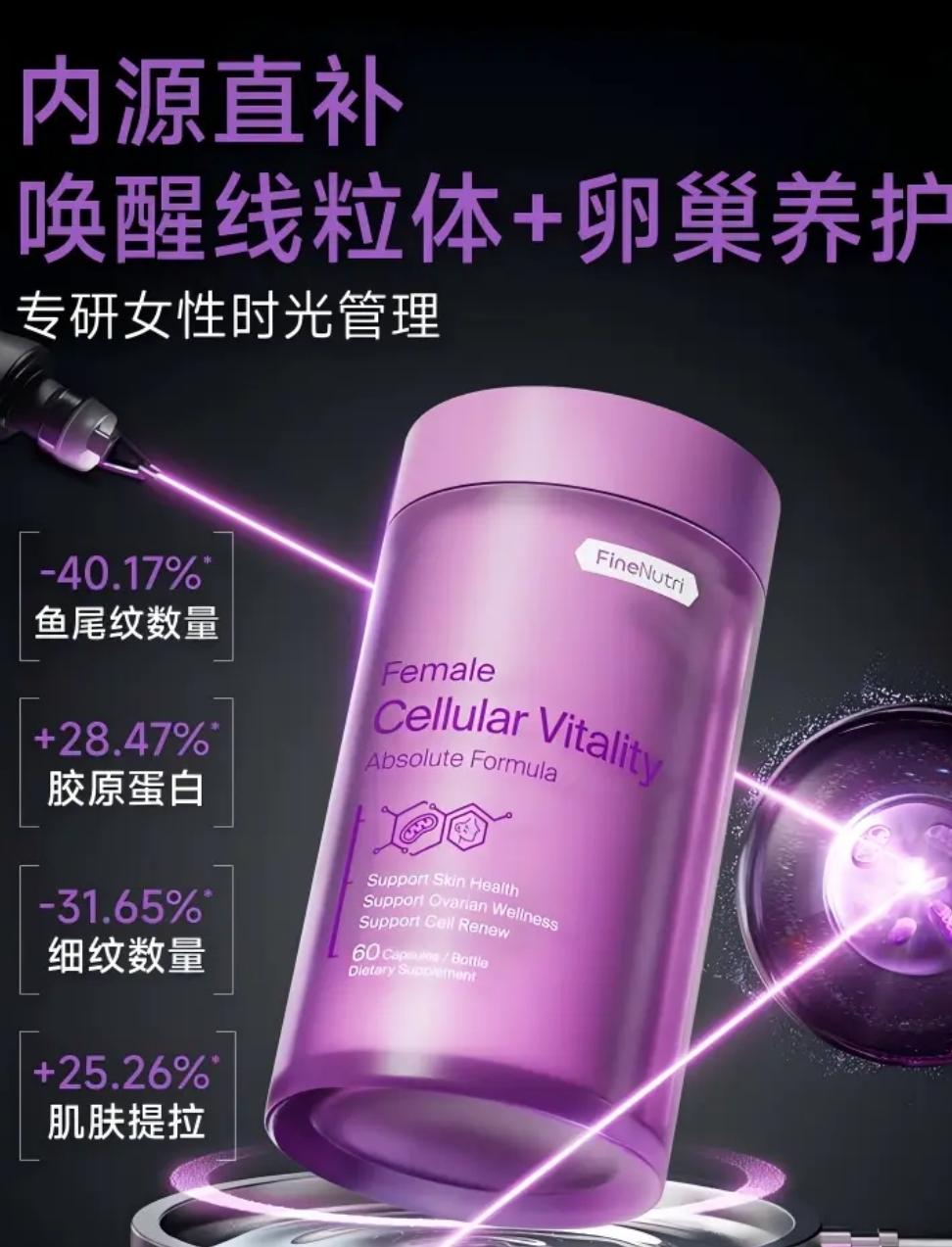 在此基础上,产品宣称通过添加麦角硫因、PQQ、共晶还原型辅酶、羟基酪醇4大核心成分,可清除线粒体中82%的自由基、增加60%的线粒体数量,并能养护卵巢。这种将复杂衰老机理转化为清晰解决方案的沟通方式,直击目标用户的核心焦虑,在信息碎片化的环境下能更高效地吸引并说服消费者。