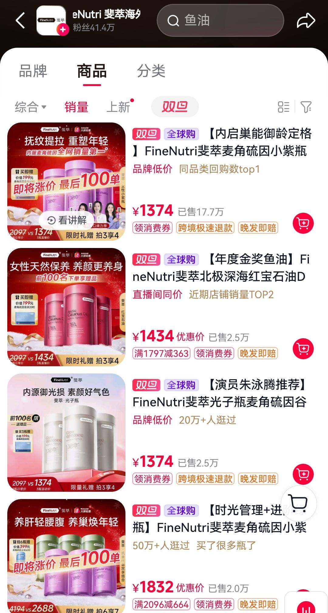 该矩阵在运营上形成“全域覆盖+垂直深耕”的双轨结构:官方旗舰店负责全品类引流,而“小紫瓶”“鱼油”“鎏金瓶”等单品直播间则聚焦特定产品和功效需求。这一布局既能广泛触达潜在客群,又能精准对接由内容种草所引导的细分流量,实现“一类一播、一品一号”的精细化运营,全面提升转化效率。