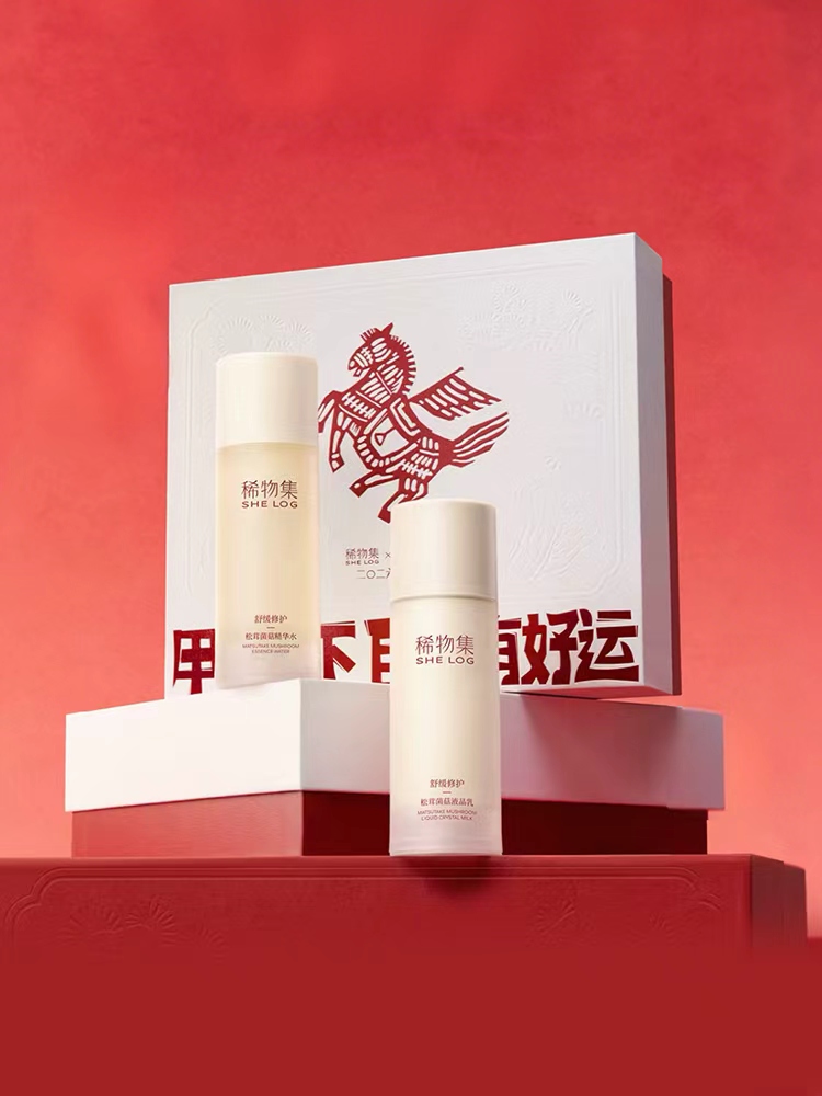 松茸水乳套装:包含100ml精华水与100ml乳液,主打舒缓维稳、保湿修护。以稀物集标志性的松茸成分为核心,结合天然植物提取物,为肌肤提供温和呵护。
