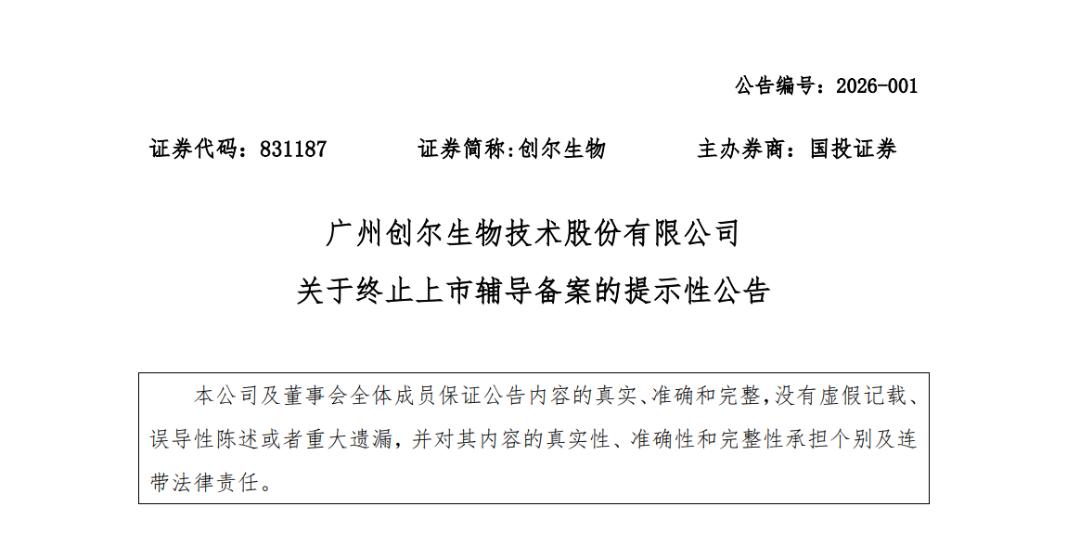 《公告》显示,经与辅导机构国投证券友好协商,双方已于2025年12月25日签署了终止上市辅导的相关协议。今年1月8日,广东证监局正式确认创尔生物终止辅导。