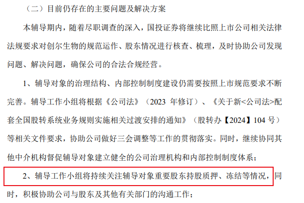 这一风险并非毫无征兆。早在2025年11月,辅导机构国投证券在定期进展报告《关于广州创尔生物技术股份有限公司向不特定合格投资者 公开发行股票并在北京证券交易所上市 辅导工作进展情况报告(第九期)》中,就已明确将“重要股东持股冻结等情况”列为待解决的突出问题。