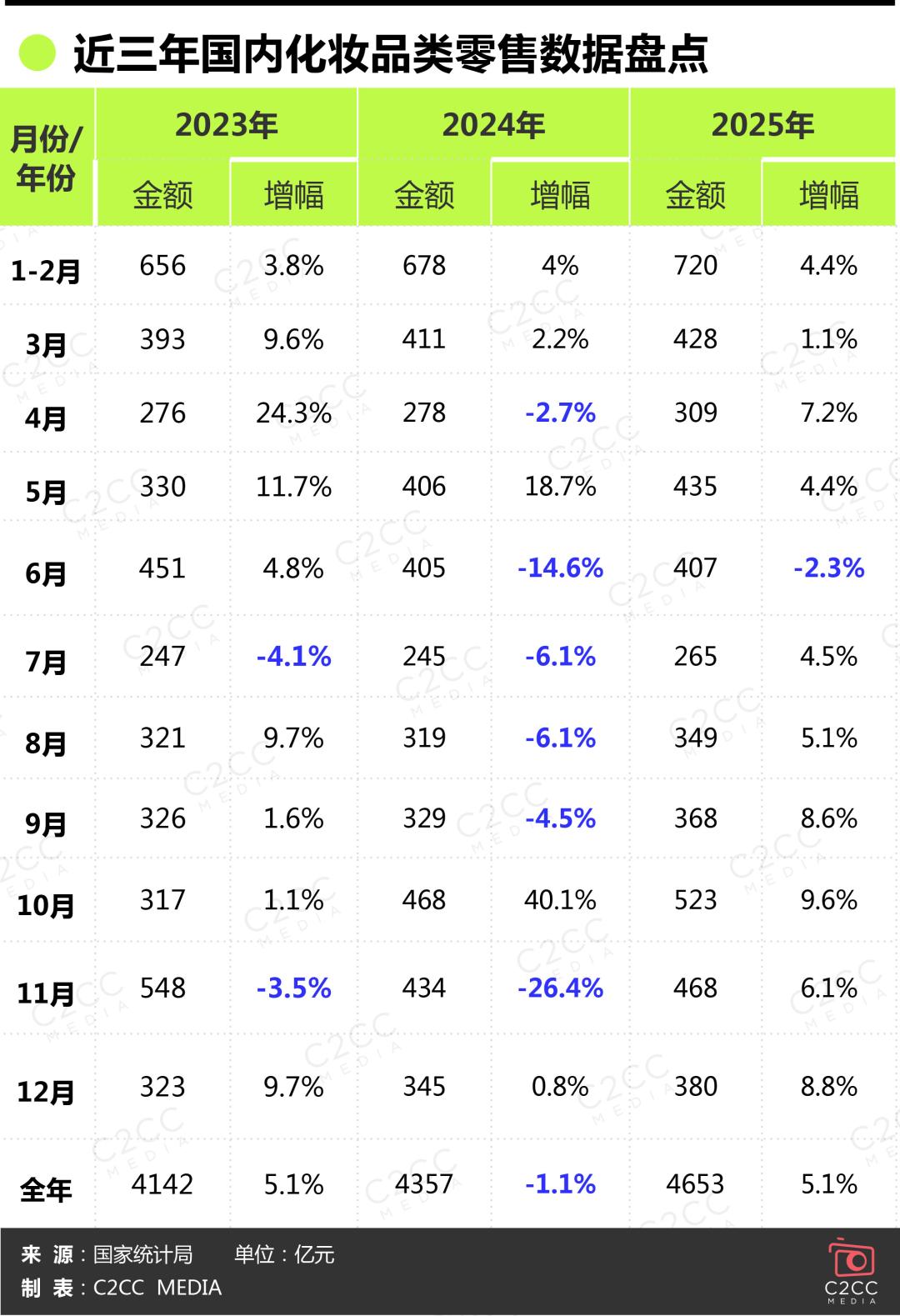 拉长时间维度来看,相比2024年有6个月出现化妆品零售额下滑,2025年仅有1个月化妆品零售额出现2.3%的下滑,其余均保持强势增长。且全年的化妆品零售额从2023年的4142亿元稳步增长至2025年的4653亿元,年增幅同样在高个位数,预计2026年或将突破5000亿元大关。