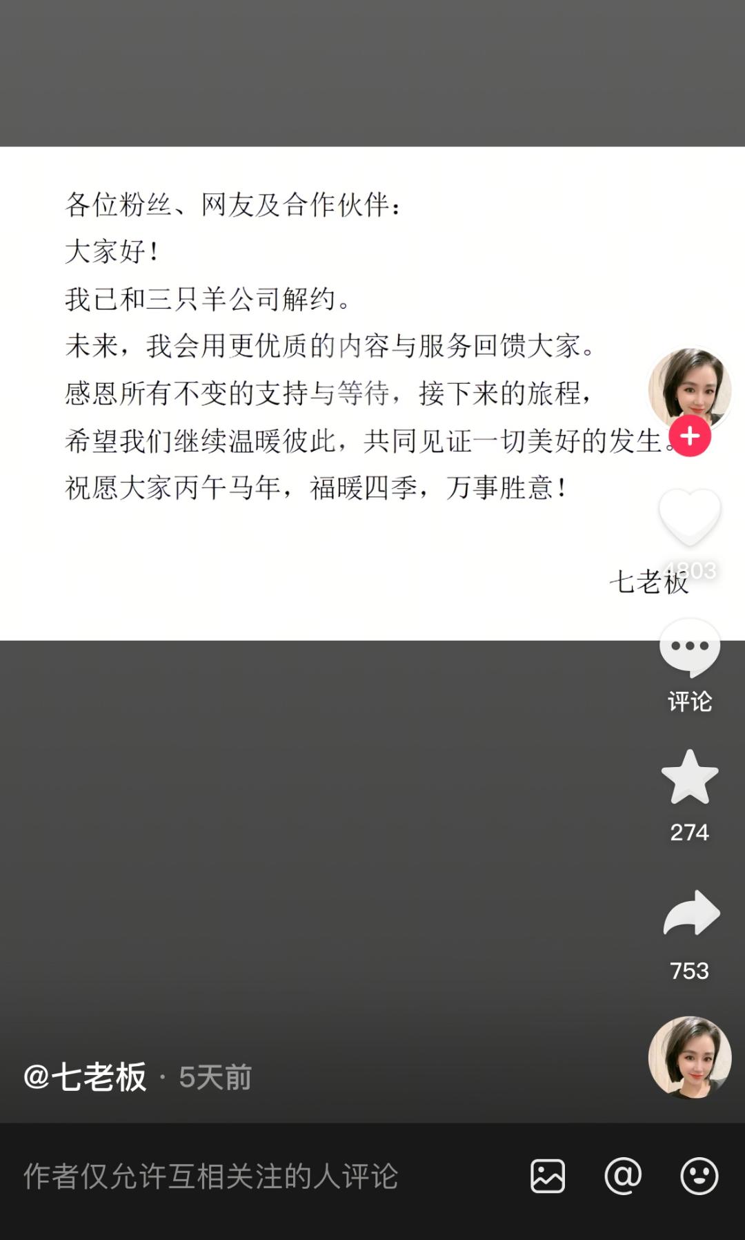 近日,三只羊集团核心主播七老板在抖音平台官宣:与所属MCN机构解约,不仅清空全平台与“疯狂小杨哥”相关的所有内容,更以“以更优质内容与服务回馈用户”的声明,为这场深度绑定的合作画上句号。