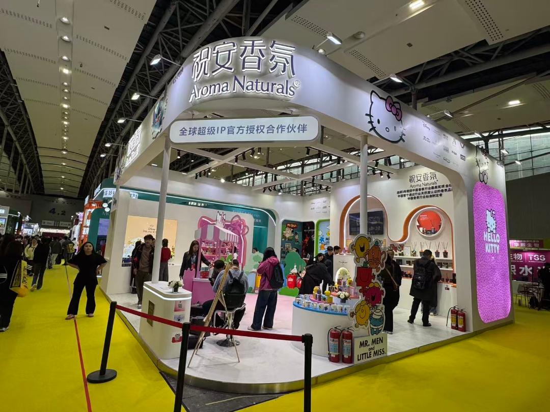 在美博会香氛展区,祝安香氛(Aroma Naturals)的展位凭借Hello Kitty等全球超级IP联名设计,成为全场焦点。