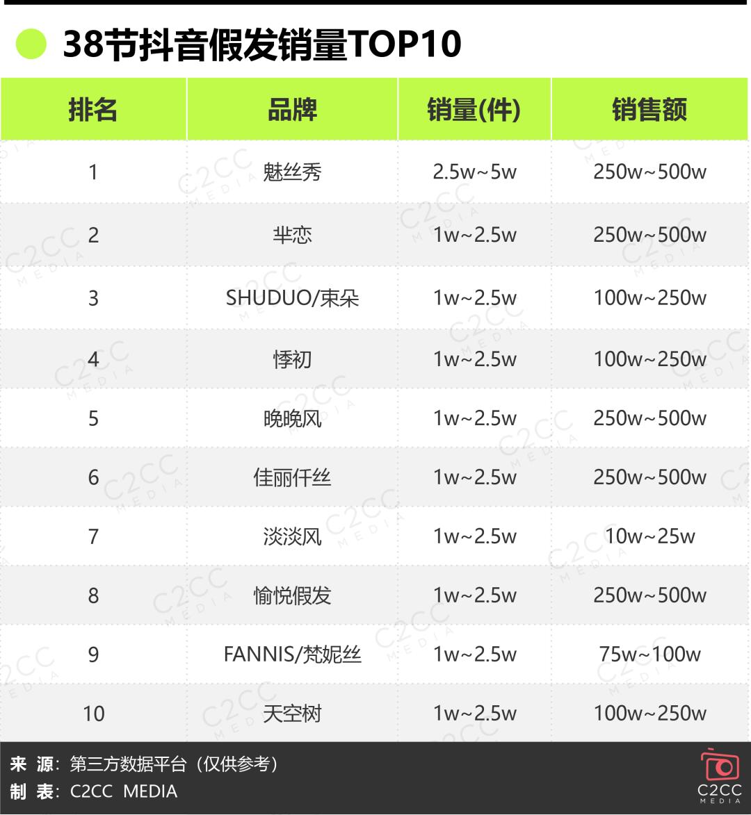 笔者查看了抖音38节假发销售榜单,发现平台型新品牌已成为赛道主力,呈现鲜明的电商原生特征: